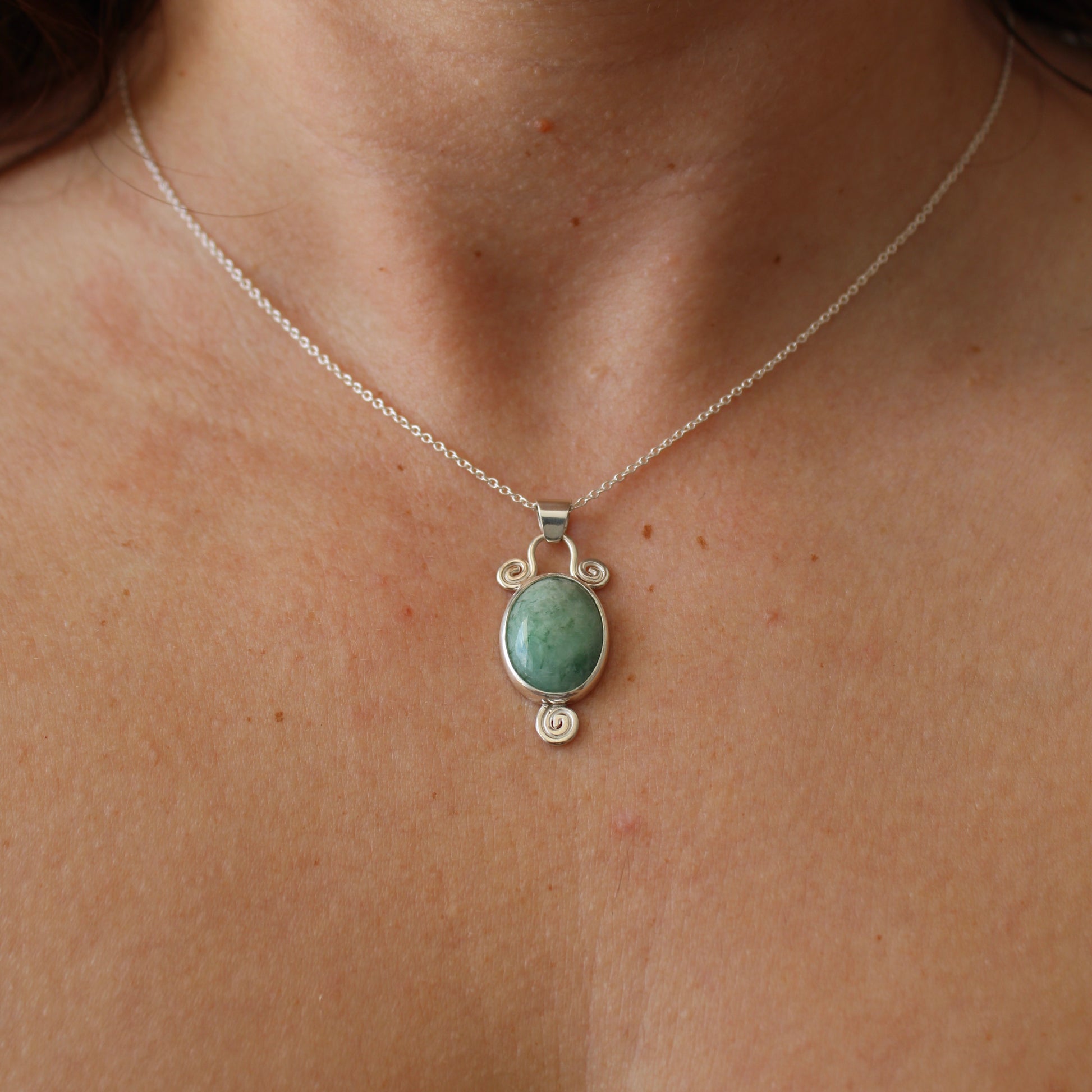Dreamy green fluorite in sterling silver with swirly details
